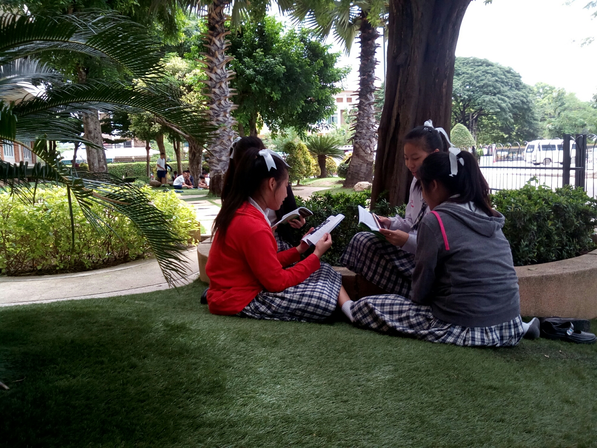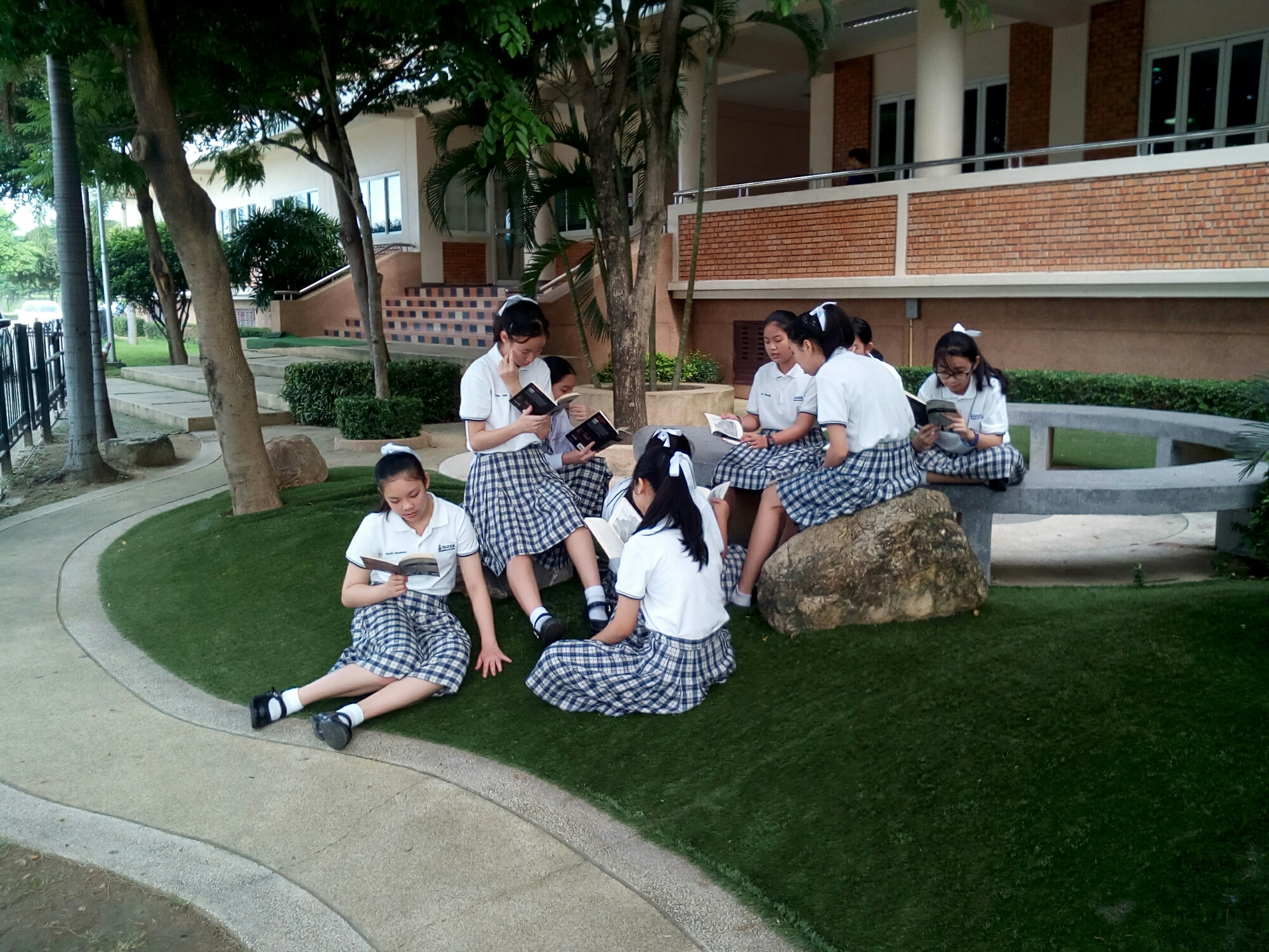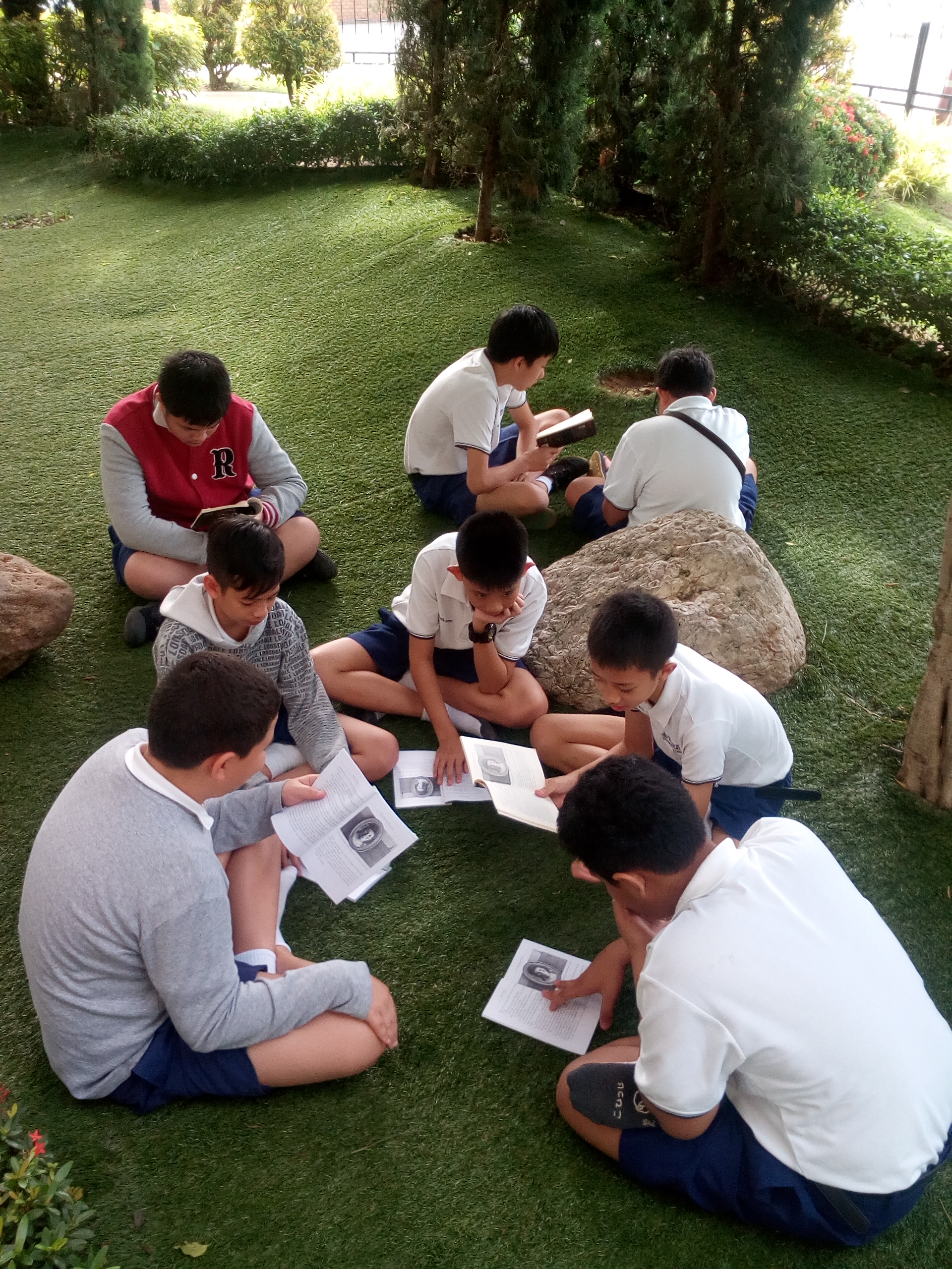 With the rainy season now well underway, the temperature around school is often ideal for outdoor lessons, and this past week the lower-secondary EP students have enjoyed taking their reading lessons on the grass.